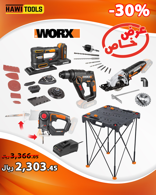 عرض كل التفاصيلWORX TOOLS 7 ITEMS SET 1- WORX 18V (20V MAX) SANDECK Cordless 5in1 Multi-Sander 2- Worx WX066 Sidekick Portable Work Table 3- Worx 18V (20V Max) Co...
