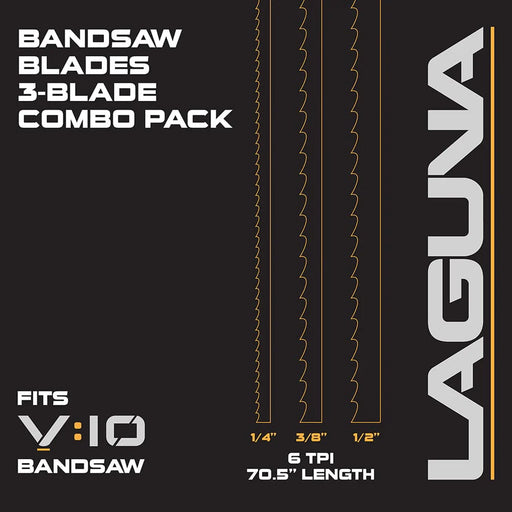 About This Product Get the cutting performance your Laguna V:10 Bandsaw deserves with the Laguna Assorted Bandsaw Blade Pack – 3 Pack. This conven...